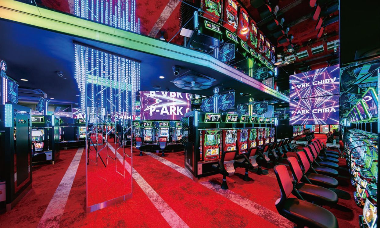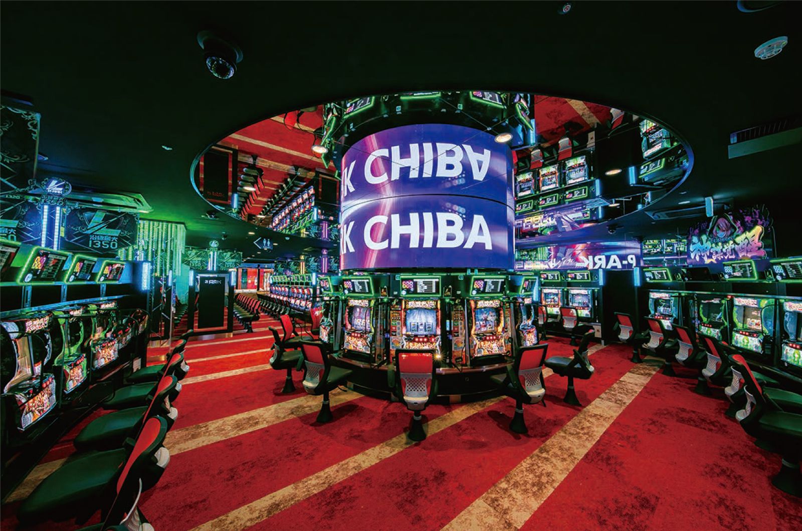 正面入り口からの店内のイメージ、円形のパチンコ島にあるサイネージ、そして周辺ミラーをはじめとする装飾の仕上がりなどが、今回の施工のこだわりポイントです。