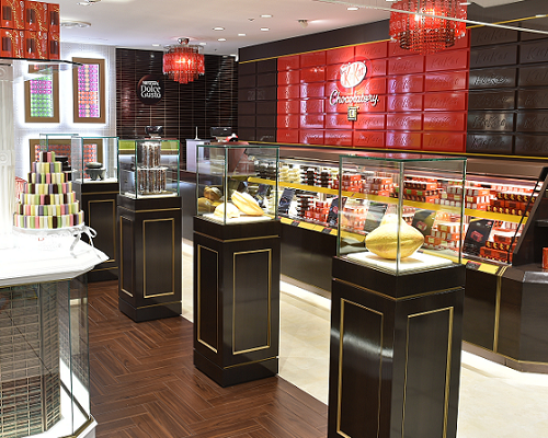 大丸京都店にOPENした、キットカットの高級志向店舗のキットカットショコラトリーです。複数社によるコンペ形式での提案の機会から、「ミュージアム」というコンセプトに共感をしていただき、設計・施工にて受注させていただきました。百貨店で展開されるインショップの為、柱巻き部分で視認性を高めてブランド訴求をする事を意識し、キットカットのお菓子から型をとり、塗装をして壁面に貼り、店内にはカカオの実や、石製すりこぎをディスプレイし、チョコレートの製造過程が感じ取れる、ミュージアムのような空間デザインとしました。